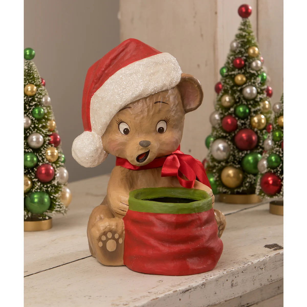 What could be in this adorable bear's bag? Anything you want! This paper mache bear is a container so you can fill him with treats, toys, greenery, or anything you would like. With his adorable Santa hat and surprised expression, this bear will be favorite for years to come.