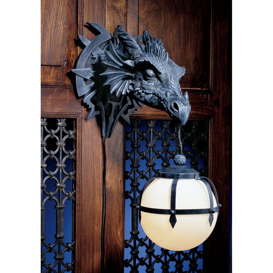 • Tales of mythical Marshgate Castle tell of dragon trophies lining its long, echoing chambers. Electrify your own castle walls with our intricately sculpted designer resin dragon that stands a full 15" from the wall and holds a hanging 6"-dia. glass orb from its menacing mouth. Switch-on 4 ft. cord; accepts your 40-watt bulb. 9"Wx11"Dx17"H