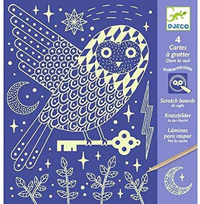 Children can reproduce beautiful motif illustrations from the artist by scratching the surface of the card. This set includes 4 cards featuring glow in the dark nightlife designs.
