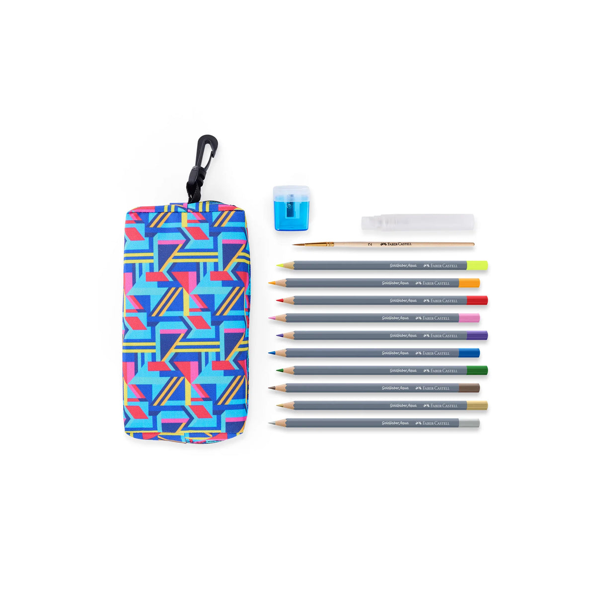 Contents Include: 10 Goldfaber Aqua Watercolor Pencils #104 Light Yellow Glaze, #136 Purple Violet, #166 Grass Green, #149 Bluish Turquoise, #176 van Dyck Brown, #121 Pale Geranium Lake, #109 Dark Chrome Yellow, #250 Gold, #251 Silver and #119 Light Magenta, 1 Zipper Pencil Pouch with Clip, 1 Sharpener, 1 Paintbrush and 1 Spray Bottle