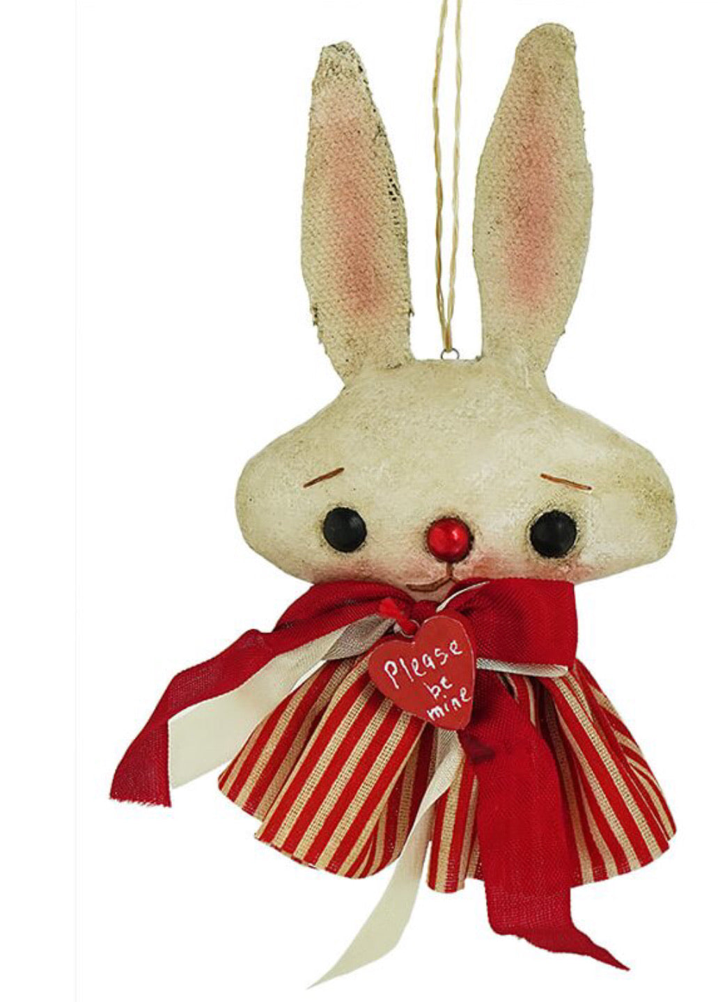 A Bethany Lowe design. If the cute ears and red and white striped dress don't get you then the big eyes and red nose on her sweet face will make you fall in love with this Be Mine Bunny ornament. Her bow has a heart that say "Please Be Mine" on it, echoing the sentiment in her eyebrows and slight smile. Hang this adorable bunny up for Valentine's Day and she can stay up through Easter too!