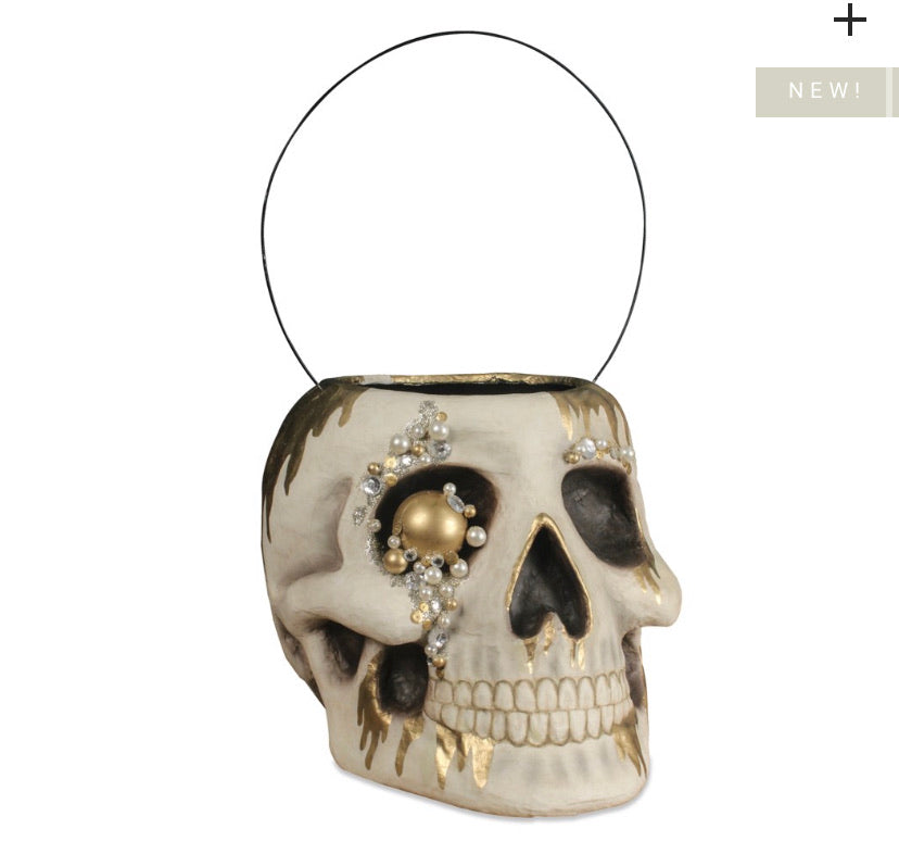 This large, Halloween skull bucket is made from paper mache and features dripping metallic gold and cascading jewels. Paper mâché, beads, glitter, and wire hanger.