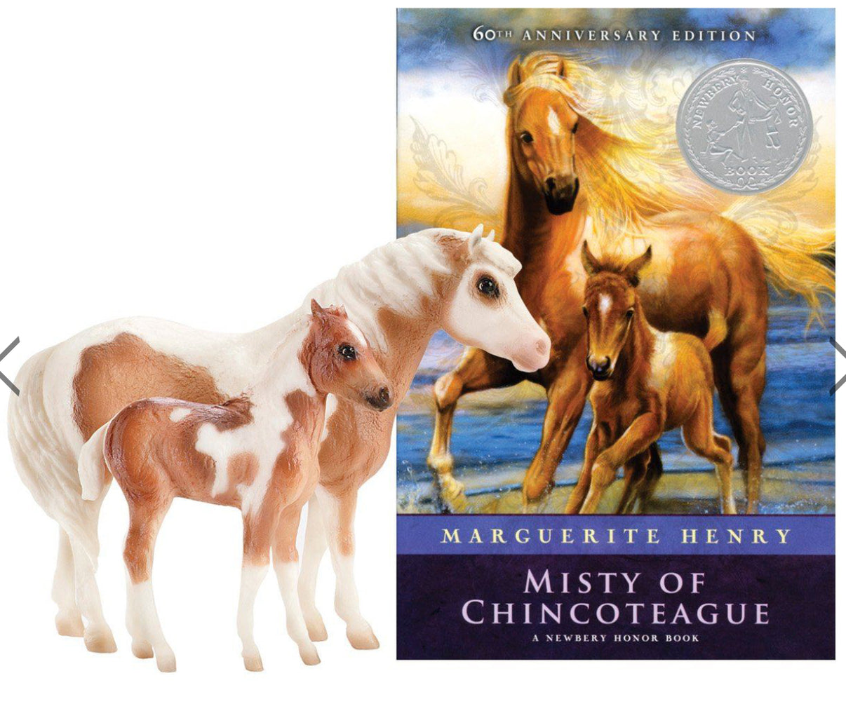 This set includes a paperback copy of Marguerite Henry's novel Misty of Chincoteague and a 1:9 scale mare and foal set.