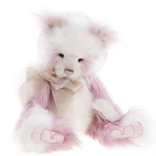 Lowra is a beautiful Plumo panda from the Charlie Bears 2021 Secret Collection. Lowra has a dense white plush body and head with lovely long ballet pink plush limbs and accents. The pink plush has a white tipping, softening the contrast in colors. Lowra has molded paw pads, embroidered with a coordinating pink thread, perfectly matching her hand embroidered nose. Lowra wears a large organza bow with rosette.