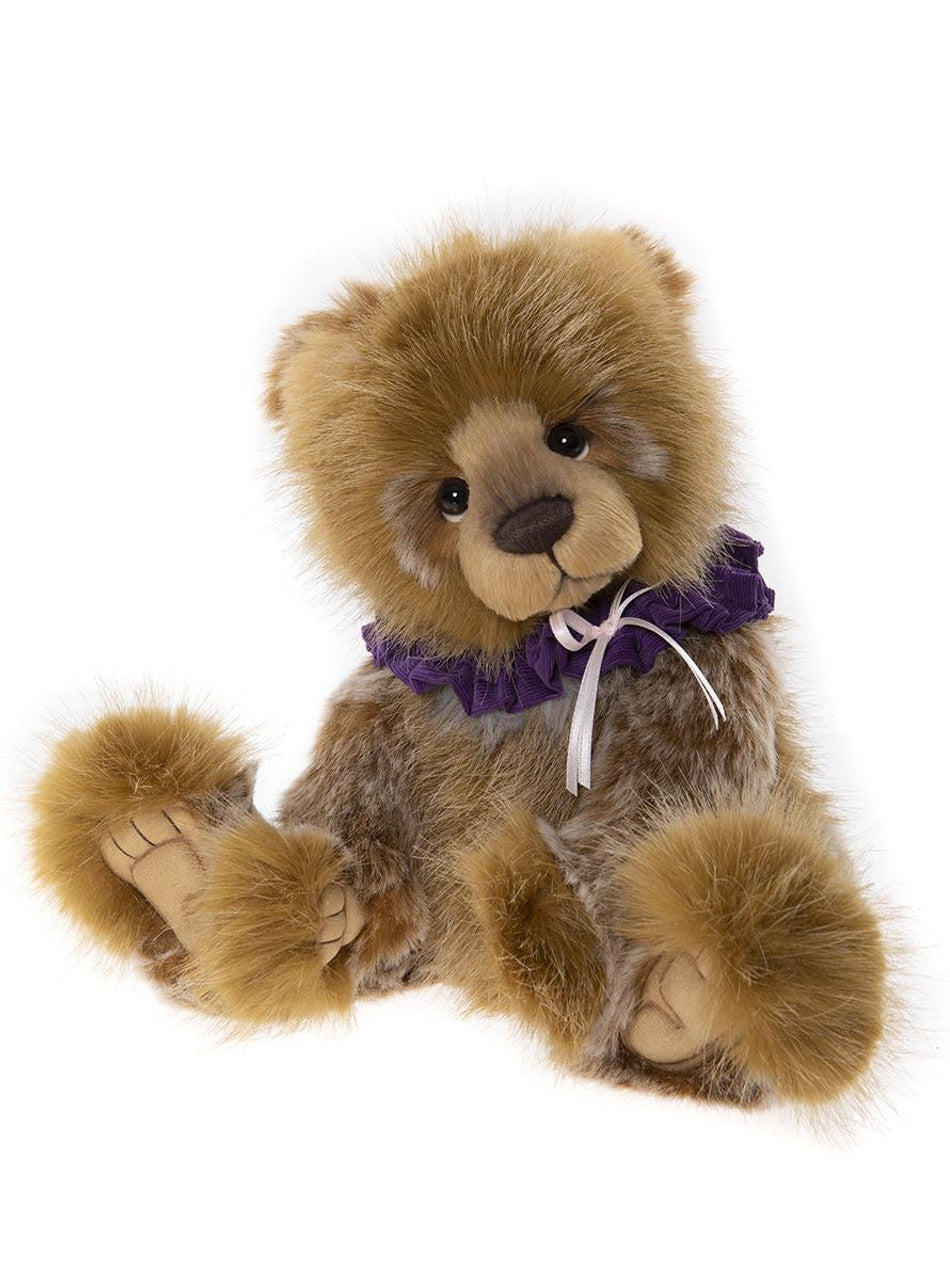15 bear paws high, Pashmina is only stocked at select stores! Pashmina is colored a beautiful honey-brown with white ends on her fur, felt padded paws, and a brown nose and eyes. She has a royal purple ruff around her neck and a tiny pink bow. For images of our bear’s faces - please text 502-693-4203