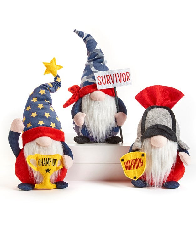 Soft plush gnome dressed in super hero colors with a heartfelt Hero sentiment. Available in 3 assorted designs: Navy Hat with Stars/CHAMPION, Red/WARRIOR, Blue & Grey Camo/SURVIVOR. Polyester. Each sold separately