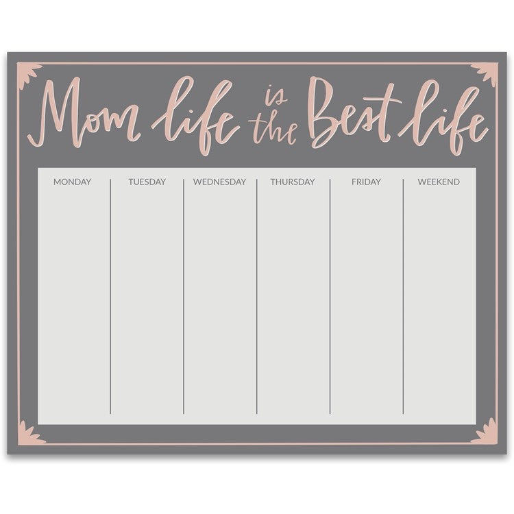 A weekly paper notepad featuring a top "Mom Life Is The Best Life" sentiment in a blush and gray palette with daily charts to keep upcoming weeks planned and organized. Contains 60 pages. Made in USA.