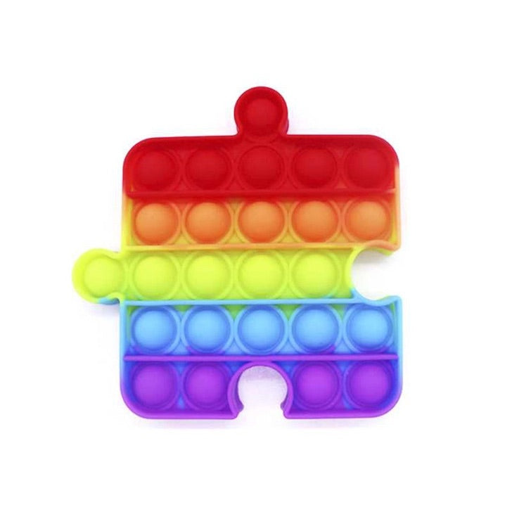 This cute little puzzle piece is ready to come home with you! This popping toy is made out of solid silicone, and comes in rainbow colors.