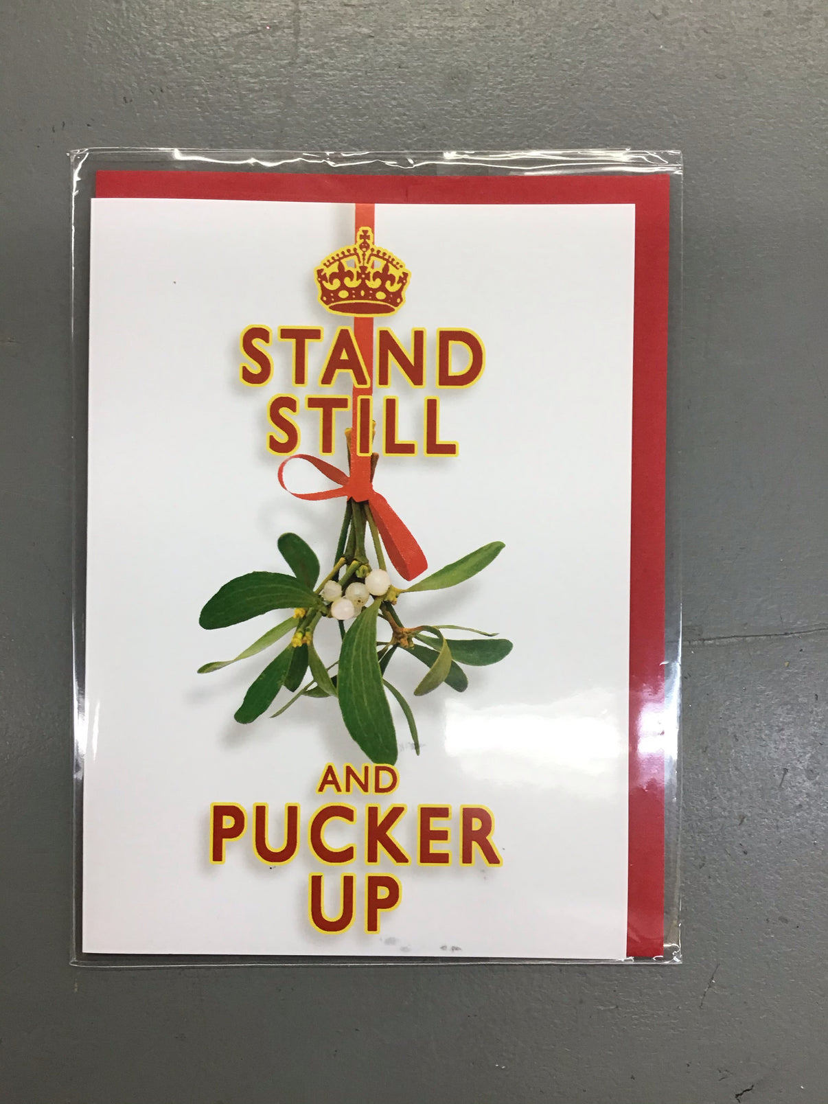 Funny stand still and picker up Christmas card. Inside says have a merry Christmas and a happy new year. Comes with red envelope