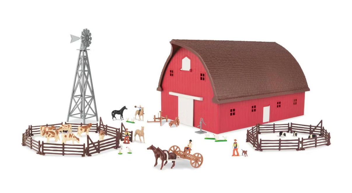 This item is made by ERTL, the leader in farm toys over the past 60+ years. The 1/64 scale ERTL Farm Country Round Gable Barn Set comes with over 73 pieces, including a red round gable barn with brown roof and white doors, brown fencing, a gray windmill, cattle and animals, figures and more! This 73-piece set has a manufacturer recommended age of 5+ years. It is not suitable for children under 3 years old due to many small parts.