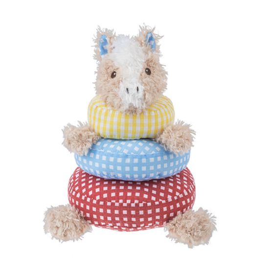 Adorable plush horse stacker with three rings to stack from Baby Ganz, 9". Blue checked fabric inside its ears makes it super cute!