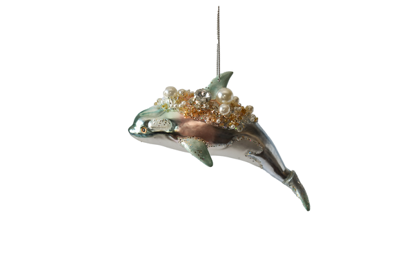 Expand your holiday decor with our Orca glass ornament. This impressive ornament is 5 1/4" W. x 2 3/4" H. and features a beautifully crafted design. Made of high-quality glass, this ornament is a unique addition to any collection. Showcase your love for marine life with this stunning piece.