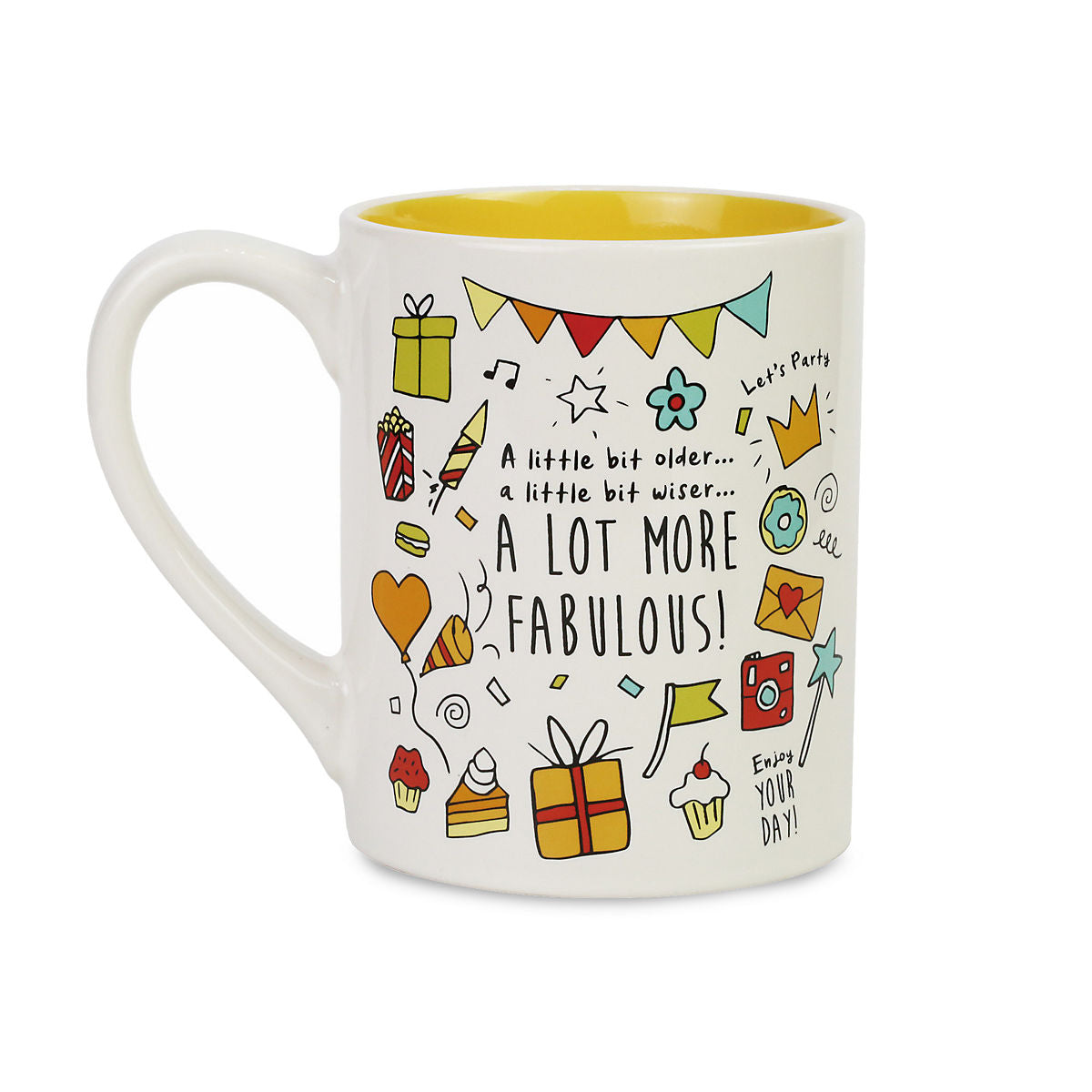 - Give them a reason to smile on their special day with the Our Name Is Mud "Happy Birthday" Mug. This celebratory mug is made from white stoneware and features colorful accents and the phrase "Happy Birthday" on the front. The back of the mug features "A little bit older, a little bit wiser, a lot more fabulous" for a fun style they will love.