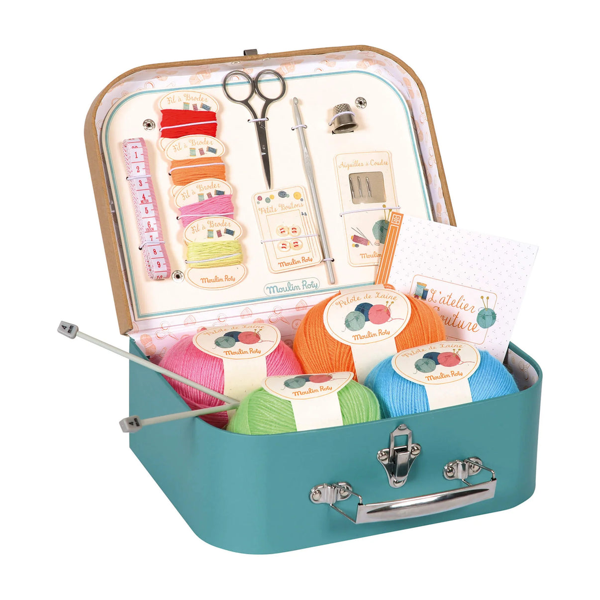 A wonderful way to introduce a child to knitting and sewing. This charming suitcase from Moulin Roty contains knitting needles, four balls of wool, needles, different coloured threads, tape measure, thimble, buttons and scissors, plus an instruction booklet. Time to get creative!