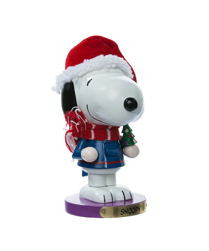This Kurt Adler Peanuts© Snoopy nutcracker is a delightful addition holiday décor or nutcracker collection! Features Charlie Brown's lovable dog Snoopy wearing a red and white Santa hat, a red and white striped scarf, and a blue coat. He is holding a small decorated Christmas tree, and stands on a round base with a gold "Snoopy" plaque.