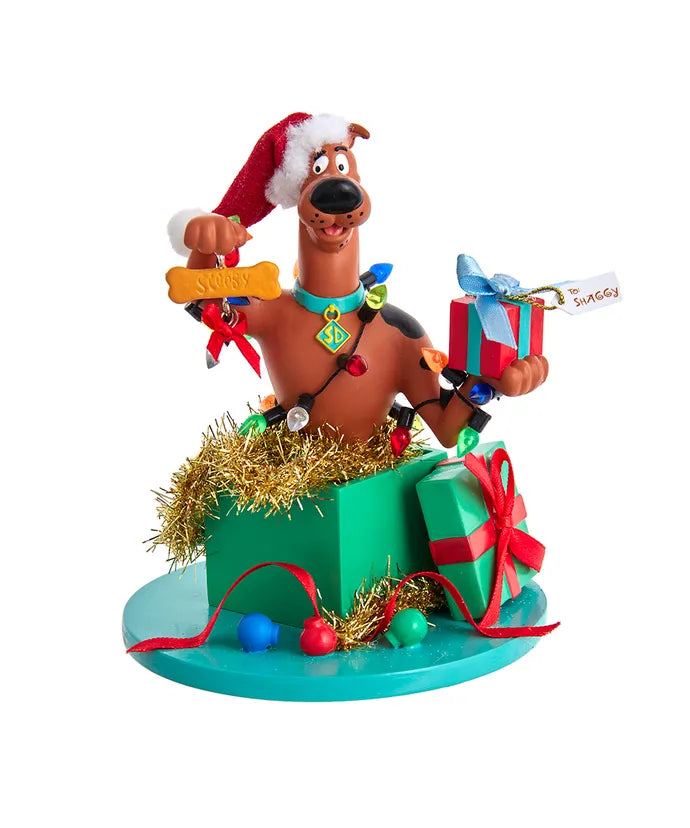This Part of Kurt Adler's Fabriché™ collection, this 5" Scooby-Doo!™ in present table piece is a fun and festive addition to any home or office holiday décor. Scooby is featured in a green and red present on a blue base with red, blue and green Christmas balls, entangled in a strand of Christmas lights and gold tinsel garland. He is holding a present for Shaggy in one hand and in the other he is holding a Scooby snack with a red bow and gold bell