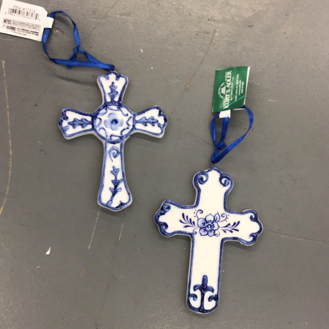 Super cute assorted cross ornaments. Made to look like delft