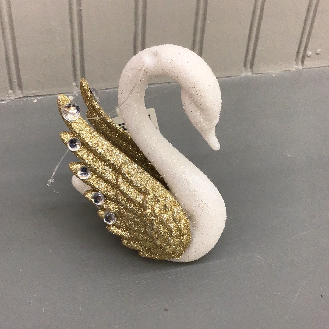 Beautiful glittered ornament of a swan. Gold wings detailed with one jewel at each tip. Approximately  3 x 5 inch