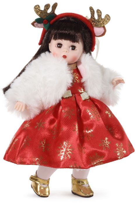 Wendy is most festively dressed for Christmas! Measuring 8", Wendy is made of vinyl with a light skin tone and is fully-articulated for fun play with jointing at her neck, shoulders, elbows, waist, hips and knees. She has classic red lips, rosy cheeks and brown eyes that open and close. Her long brown hair is topped with a red and gold reindeer headband. Wendy wears a faux fur coat over a red dress with a gold snowflake motif. White stockings and gold shimmery shoes complete her wintry look. Deer Santa Light Skin 20744 is a 2023 edition from Madame Alexander's Seasonal Collection. Suitable for ages 14 and up.