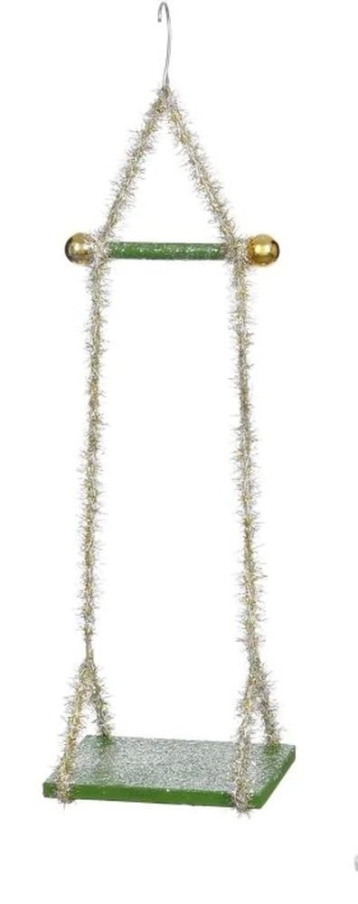 Super cute swings perfect for elves from Mark Roberts! The green swing has ropes made of gold and silver tinsel, and the bar is capped by shiny gold ends. The white swing is striped with green at the base, and has ropes made of iridescent tinsel, decorated with peppermints, pink fruit slices, and green and pink candies. The red swing has ropes made of red and white puffs, with gold thread in between each of them, capped by green ends.