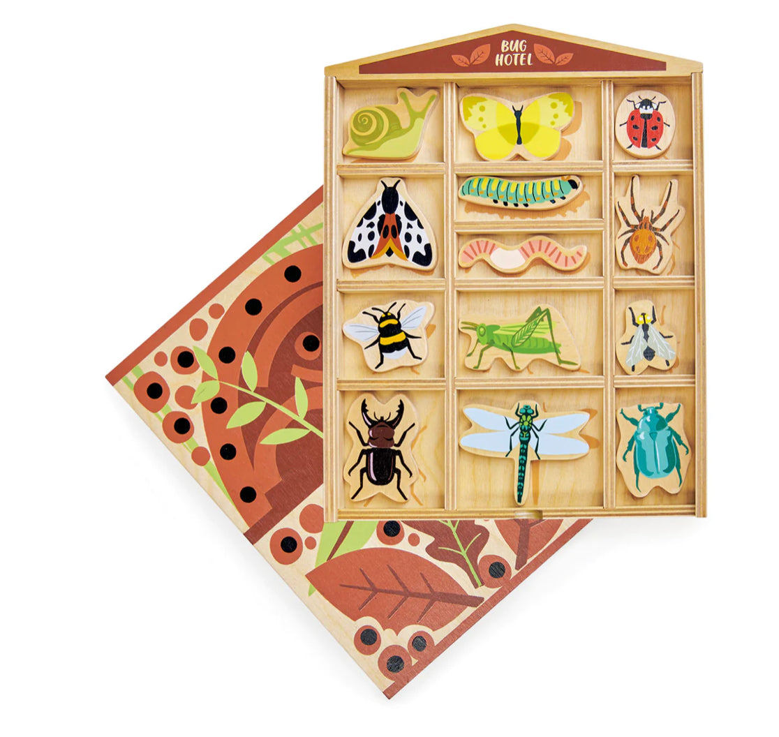 13 common garden bugs are illustrated here on plywood and contained in their very own bug hotel. Set includes: snail, butterfly, ladybird, moth, caterpillar, worm, spider, bumble bee, grasshopper, fly, stag beetle, dragonfly, and scarab beetle. Each piece has its name printed underneath.