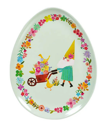 7" Egg Shaped Floral Patterned Spring Plate | Melamine | Green w/ Gnome