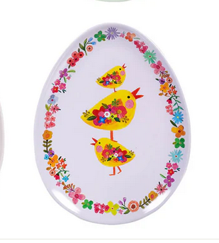7" Egg Shaped Floral Patterned Spring Plate | Melamine | Purple w/ Chicks