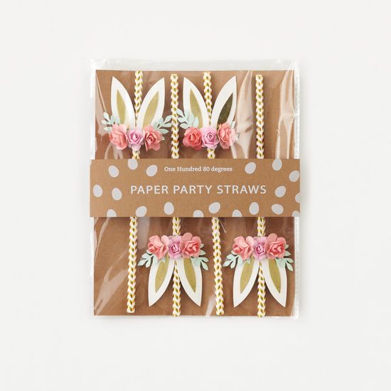 These adorable Easter paper straws are a fun and whimsical addition to your Easter celebrations. Each set includes 4 straws, with paper flowers and bunny ears, and the straws have white and gold chevron stripes. These are paper, so after sitting in a drink for too long, they will deteriorate some, but they sure look pretty! Made by One Hundred 80 Degrees, these are about 8 inches long.