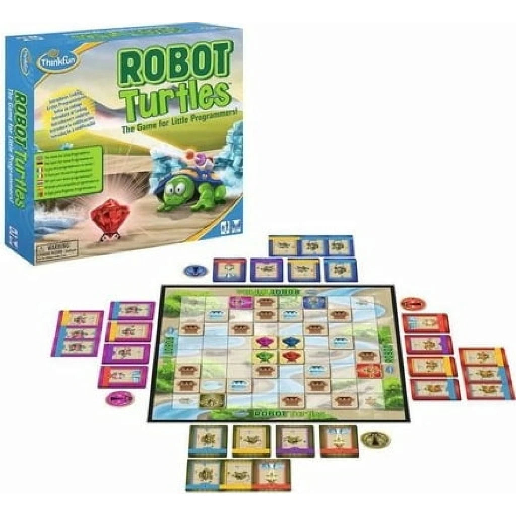 Contents: Game board, 4 robot turtles, 4 gemstone tiles, 36 obstacle tiles, 4 "Bug!" Tiles, 4 sets of code cards