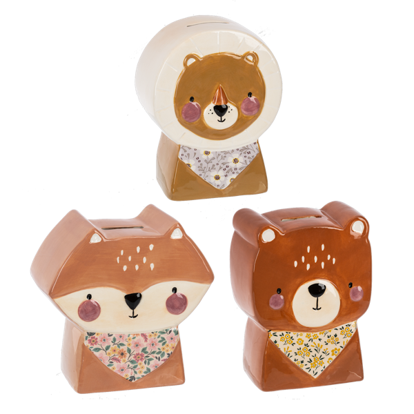 These adorable piggy banks are designed as animal characters, making them a fun and unique addition to any room. Available for purchase separately, they are perfect for teaching children the importance of saving money while adding a touch of cuteness to their space. Made of Ceramic. Fox, Lion and Bear.