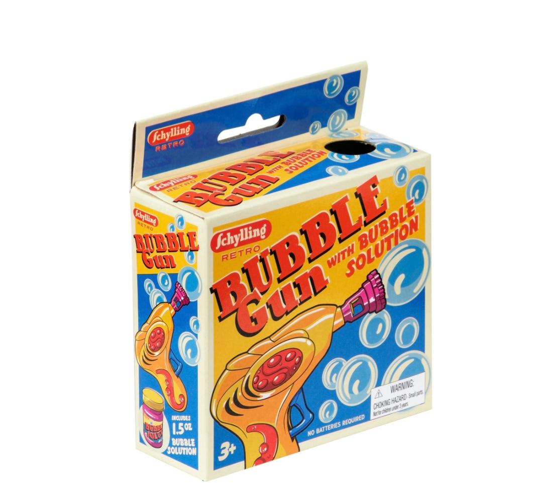 Classic toy pistol for hours of old fashioned fun. This plastic space style toy gun fires streams of bubbles; just fill it with soap solution from the included bottle. Includes bottle of soap solution. Made of plastic. Does not require batteries.