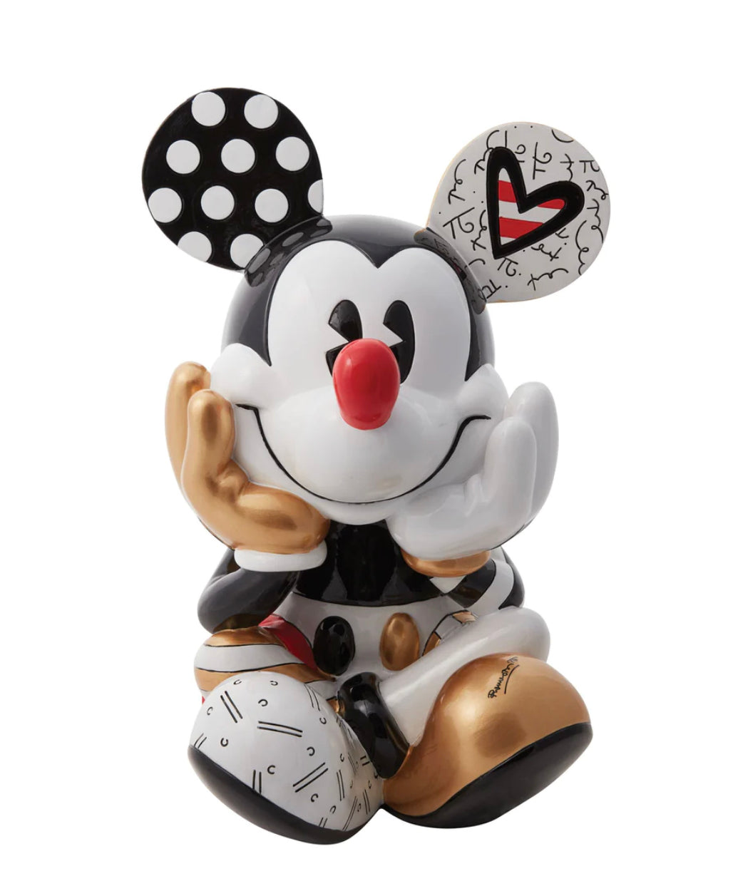 Pop Artist Romero Britto gives this super sized Mickey Mouse the Midas touch with this classic black and white look with bold patterns and dynamic design and, naturally, a touch of gold.