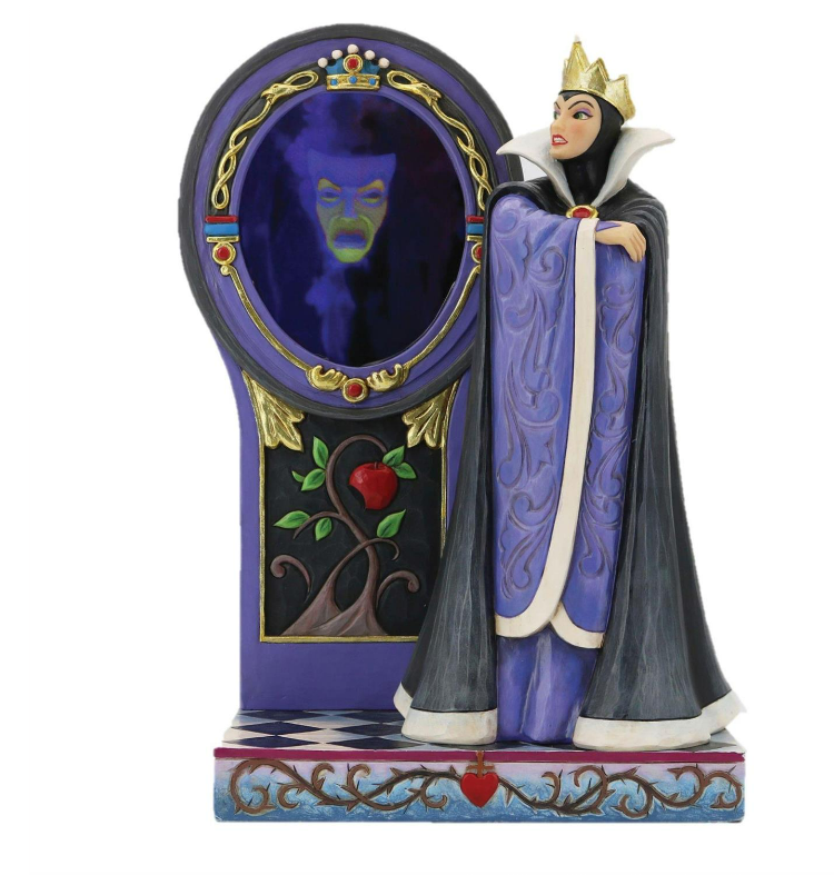 Questioning the Magic Mirror, the Evil Queen folds her arms in disgust when she is not named the fairest of them all. With a foreshadowing image of an apple, this impressive design by Jim Shore features gorgeous and enchanting details.