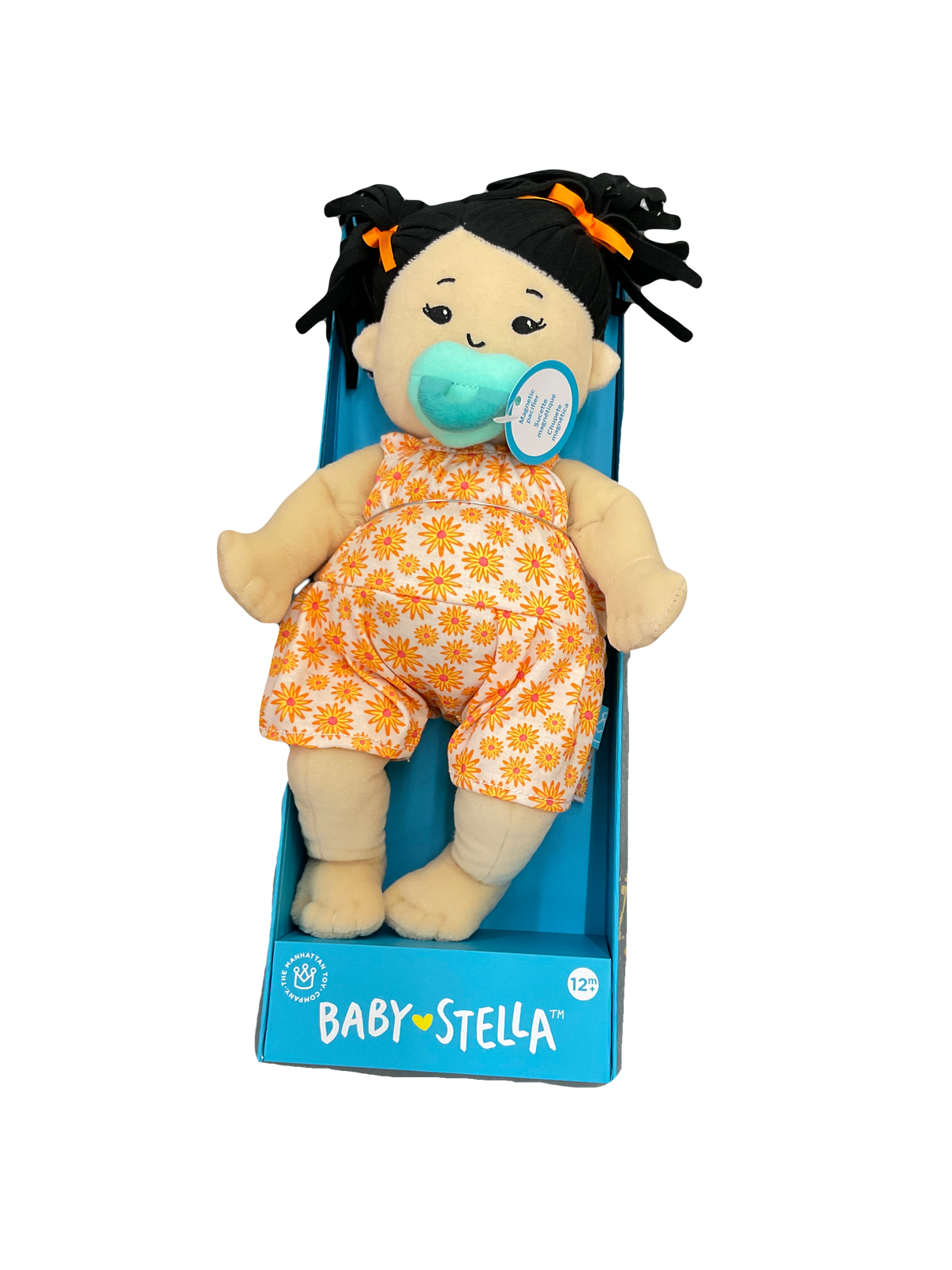 The Baby Stella Black Hair Soft Doll includes a removable diaper, a one-piece outfit with closure, and a pacifier that attaches magnetically to her mouth.
