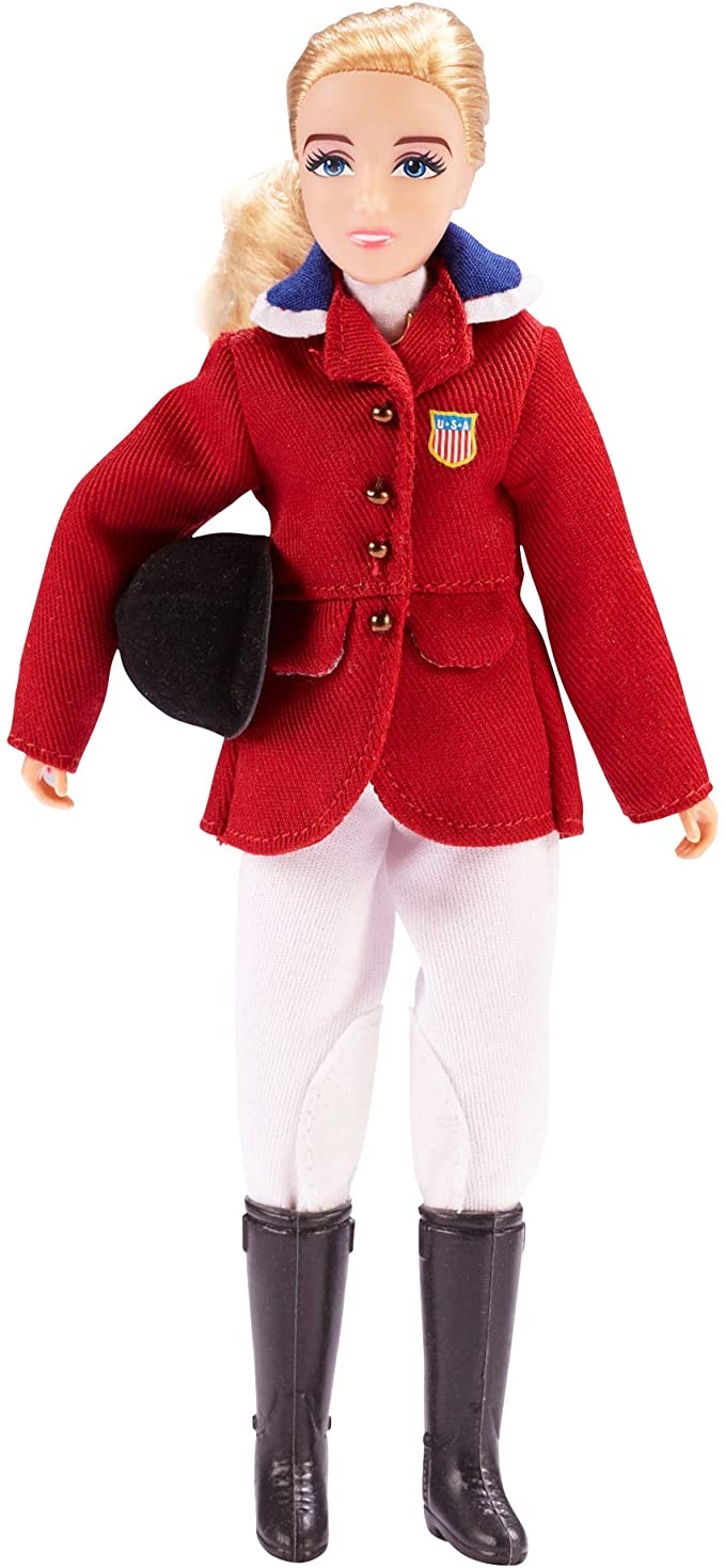 Brenda is dressed in her best and ready to soar over fences! This 8" doll is fully-articulated and dressed in the traditional scarlet coat, black velvet hunt cap, light-colored breeches and black boots of international riders.