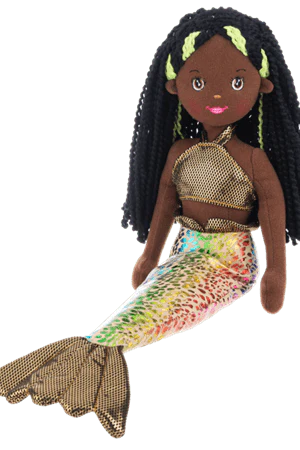 Meet Sirena! Beautiful long black hair adorned with green accents, a shiny top, and a gold tail with shimmery scales. She is a Ganz Shimmer Cove Mermaid Doll, part of a collection of beautiful mermaids. Each mermaid is unique in her design and name. Each girl is ready for her next adventure into any world your imagination can take you, or simple to bed as a snuggle partner waiting for tomorrows adventure! Approximately 18 inches long. Recommended for ages 3+. Surface washable.