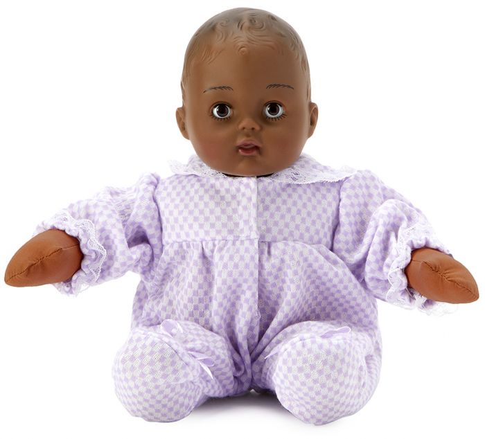Lavender Check Huggums is the sweetest 12" baby doll with a warm dark skin tone, sculpted hair and blue eyes that open and close. This classic baby doll is perfect for tiny hands. Lavender Check Huggums is meant to be hugged. She has a snuggly, huggable cloth body and her head is made of vinyl. She wears a lavender and white-checked footed onesie with a Peter Pan collar. Huggums is the classic Madame Alexander baby doll beloved by generations of little girls! Part of the Baby Alexander Collection. Suitable for ages 2 and up.
