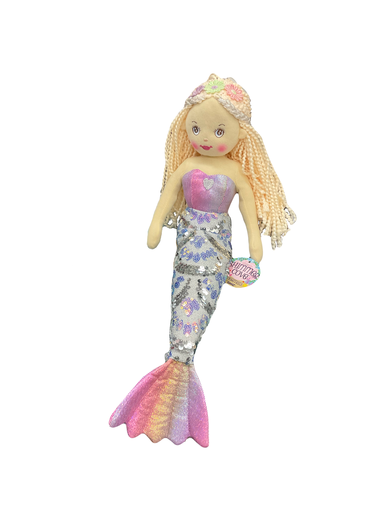 Transform playtime into a sparkling adventure with the Shelly Shimmer Cove Plush Mermaid Doll. This 18-inch mermaid doll dazzles with shimmering sequins and soft plush fabric, bringing the magic of the sea to life. With her captivating presence and intricate details, Shelly is sure to become a beloved companion for your loved one.
