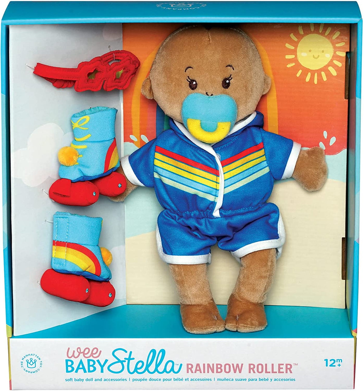 A rolling rainbow rider for playtime fun! Set includes beige Wee Baby Stella doll with a brown hair tuft, dressed in a hooded jumpsuit with rainbow stripe, fabric roller skates, star-shaped glasses, and matching magnetic pacifier. Our Wee Baby Stella dolls feature plump tummies, bellybutton, and embroidered facial features. Doll play encourages nurturing, fostering motor skills and language development.
