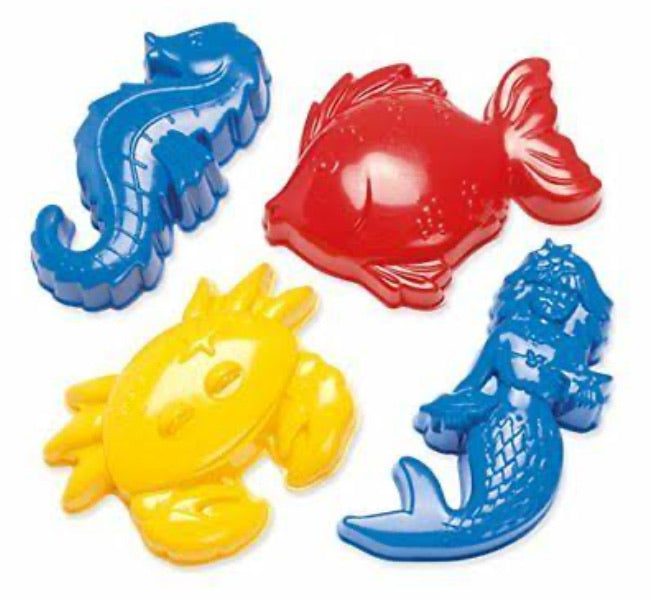 Set of sand molds including a fish, a crab, a mermaid, and a seahorse.