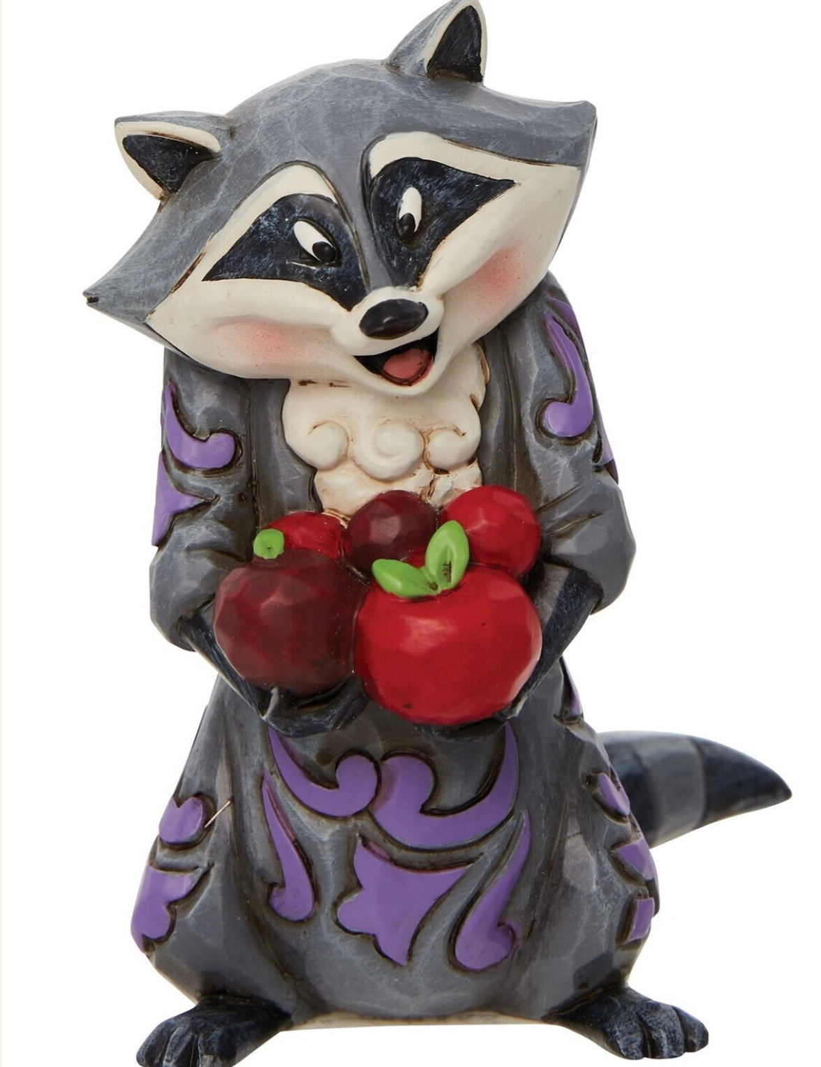 Meeko, the beloved racoon from Disney's 1995 animated feature film, Pocahontas, loves food, especially John Smith's biscuits. In this Jim Shore miniature, the resourceful scavenger has found a bounty of apples. His face lights up at his snack.