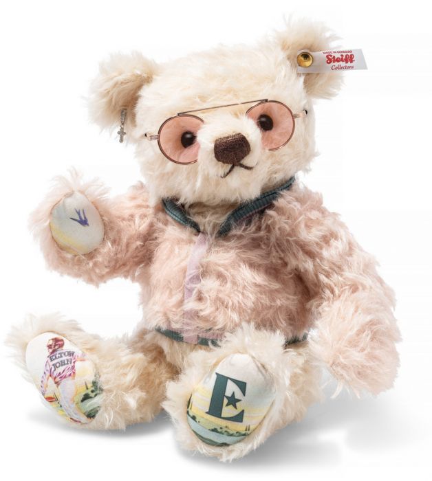 Introducing the "Steiff Rocks!" Elton John Teddy Bear: This year, we celebrate the outstanding musician Elton John and his iconic 1973 album "Goodbye Yellow Brick Road" with this Limited Edition masterpiece. Artwork from the legendary album cover is printed on the bear's paw pads and "Elton John" is embroidered on the back of his pink mohair jacket. With impeccable attention to detail, this stylish Teddy Bear rocks exclusive sunglasses from the "Elton John Eyewear" collection and a single rhinestone earing. © 2022 HST GLOBAL LIMITED