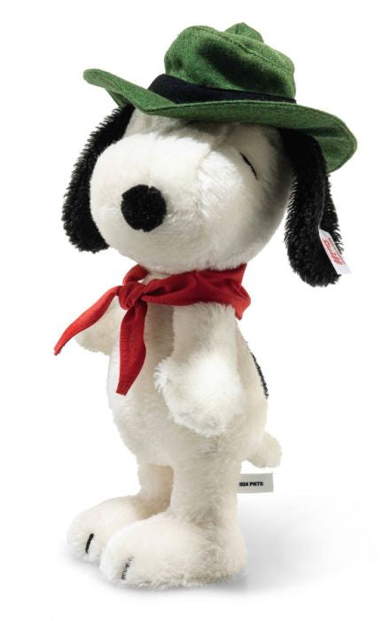 Standing 11 inches tall, Snoopy Beagle Scout is three-way jointed and crafted by hand from the finest black and white Steiff Schulte mohair. Steiff designed him in celebration of the 50th anniversary of the Snoopy Beagle Scout and so, of course, he is dressed the part just as he was drawn. Tied around his neck, Snoopy wears his scout scarf made of red cotton. Upon his head is his green scout hat with a felt black band around it. Steiff artisans gave him embroidered eyes, eyebrows, mouth and claws for the perfect Snoopy expression. This precious pup also has flat paw pads for easy standing. You'll love him!