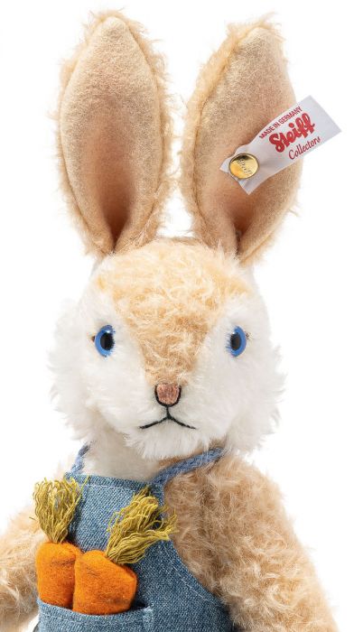 Beautiful bunny Carrie has a question for you: "Have you eaten your veggies?" If not, then she is pleased to share the newly-harvested carrots from her garden. After more than a decade, the perpetually popular rabbits in this long-running Steiff series continue with this irresistible bunny. Carrie proudly takes her place among the all-time favorites in this much-loved collection. This posable bunny wears an adorable denim apron already filled with her harvest - two oversized felt carrots from her garden. Her fine detailing and supreme craftsmanship make Carrie a Steiff item to be cherished forever. Whether you're a long-time collector or you're starting your Steiff collection today, Carrie should definitely be on your list of must-have favorites. Carrie stands 8 inches tall and is 3-way jointed (head and arms). She has a very cute, little hand-stitched nose. Her body is made of the finest Schulte curly mohair in a beautiful apricot hue. Her denim garden apron is color-coordinated with her beautiful blue eyes. She wears the iconic Steiff gold-plated button-in-ear.