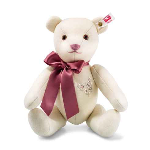 Both lovers of modernism and traditionalists will appreciate our main Club edition for the year. Sewn from genuine wool felt made by one of our oldest suppliers, this magnificent creation stands almost 12" tall and is five-way jointed. She has brown pupil eyes and hand-stitched facial features in the color of antique roses. A matching deep pink ribbon adds to her traditional, feminine appeal. But what really sets her apart is the delicate Springtime butterfly outlined in magnificent Swarovski® crystals -- a modern touch that will simply take your breath away! Production is strictly limited to the 2018 calendar year only, so there's no time to waste in making her yours.