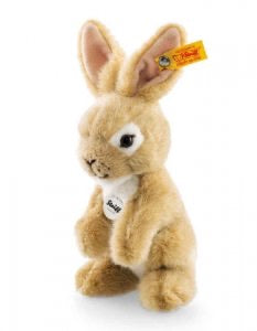 9" including ears,2016, Beige woven acrylic/polyester fur, white chest,tummy and cute little tail, sitting upright he is perfect for Easter baskets, air brushed facial features, dark safety eyes, turned down front paws. Non jointed, machine wash warm, made in Tunisia to Steiff spexcifications.