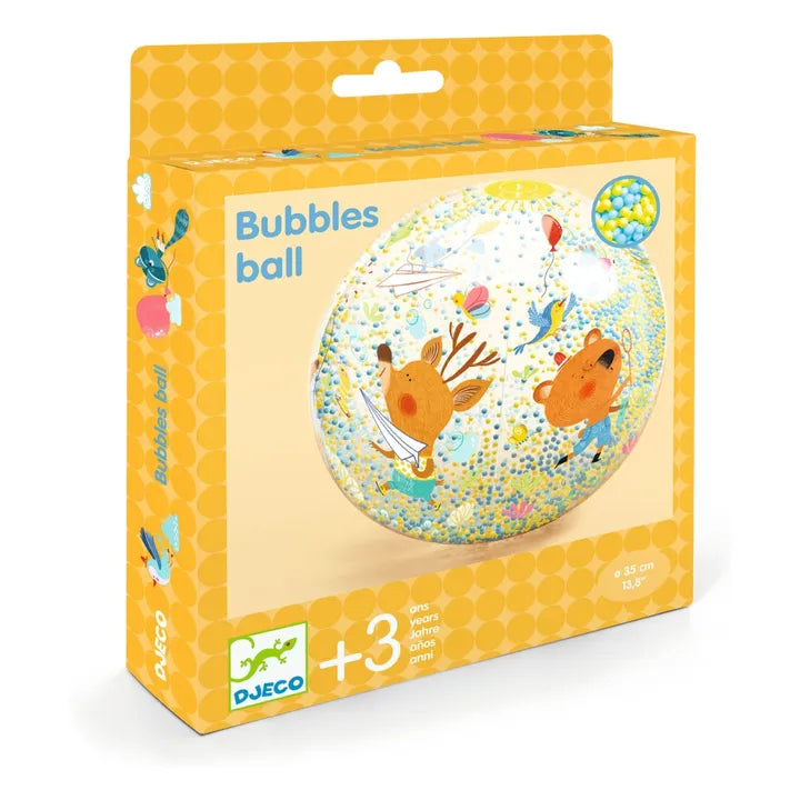 Bubbles ball is a lovely, light, easily transportable inflatable ball measuring 35 cm in diameter with bubbles and playground-themed illustrations. The filling makes it perfect for children, who will be captivated by the moving colored beads. Perfect for use indoors or outdoors.