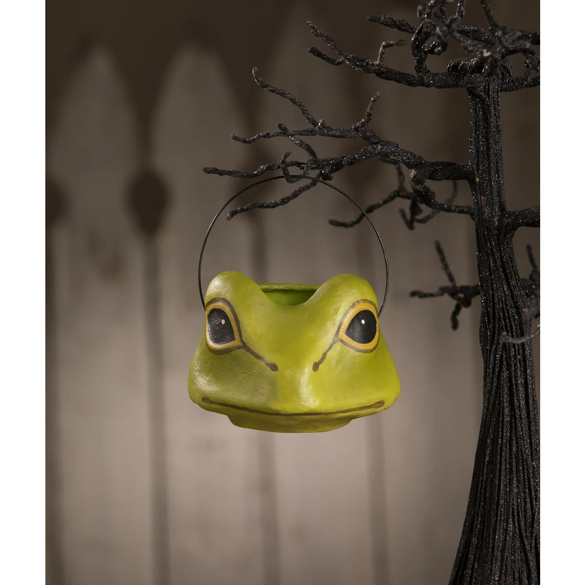 Introducing the charming Froggie Small Bucket by Bethany Lowe! Crafted with paper mache and wire, this green frog candy bucket is perfect for decorating Halloween trees or filling with sweet treats as a delightful gift. Measuring 3.5" x 3.5" x 2.75", it's a cute and versatile addition to your holiday collection.
