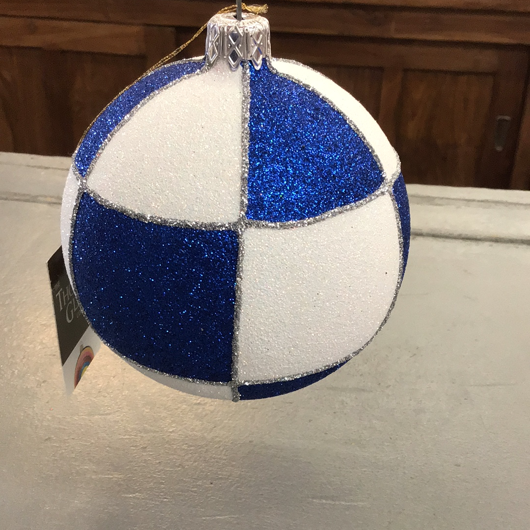 Blue and White Checkered Glittered Blown Glass Ornament 1027