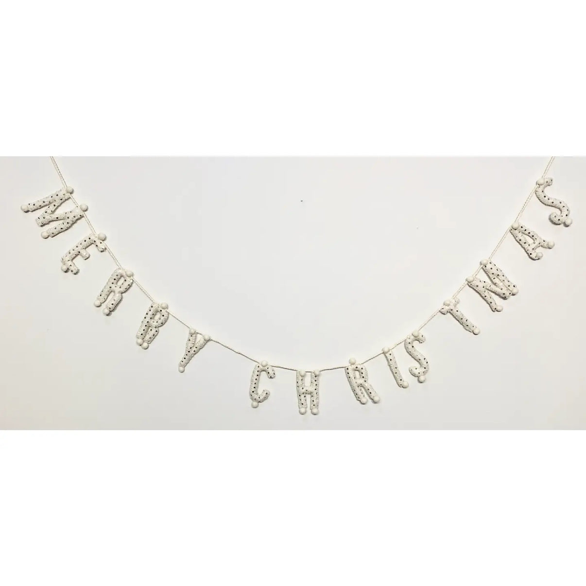 4.2ft Felt garland, MERRY CHRISTMAS Cream w beads stitched. Made in Nepal • Weight: 3.2 oz (90.72 g) • Dimensions: 60 in (152.4 cm) .